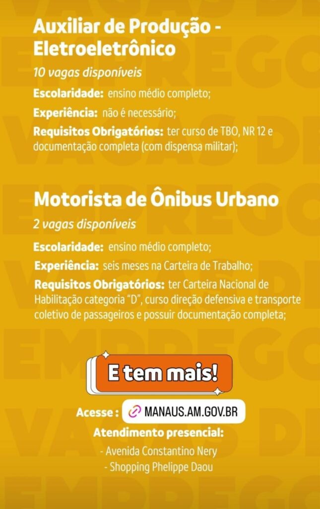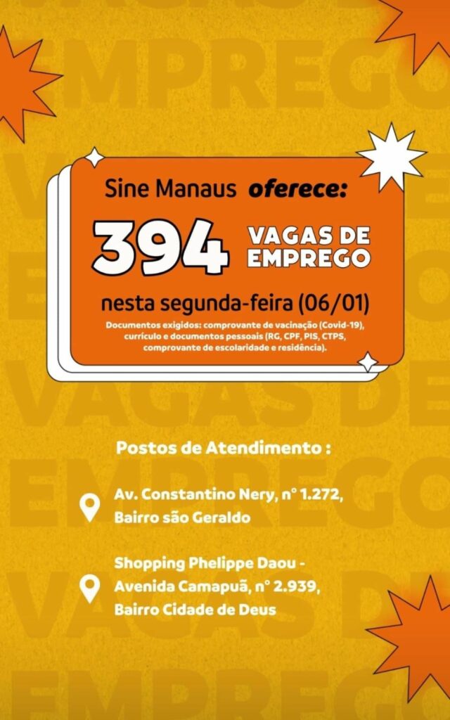 25 vagas para Auxiliar de Produção e mais diversas outras Sine oferece 394 vagas de emprego em Manaus