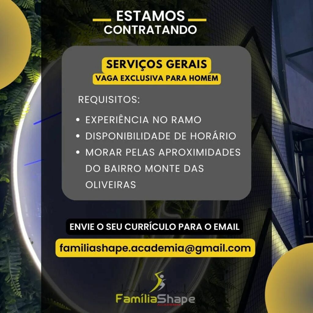 Academia seleciona Serviços Gerais; Envie seu currículo!