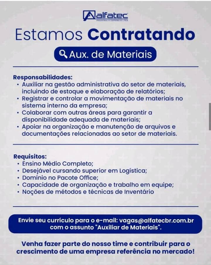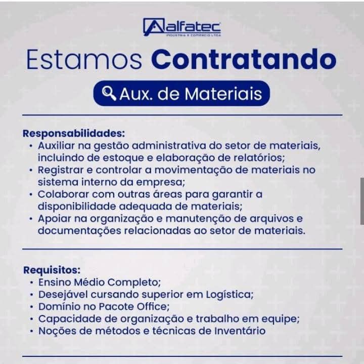 Alfatec está selecionando Auxiliar de materiais; Envie seu currículo!