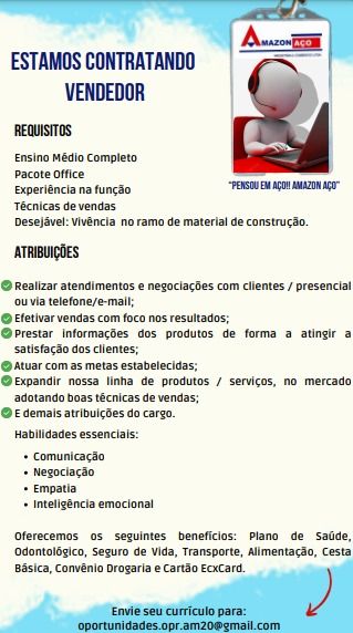 Amazon Aço recrutando para três vagas de emprego em Manaus
