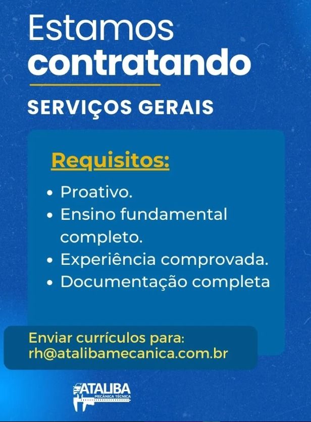 Ataliba mecânica seleciona Serviços Gerais; Envie seu currículo!