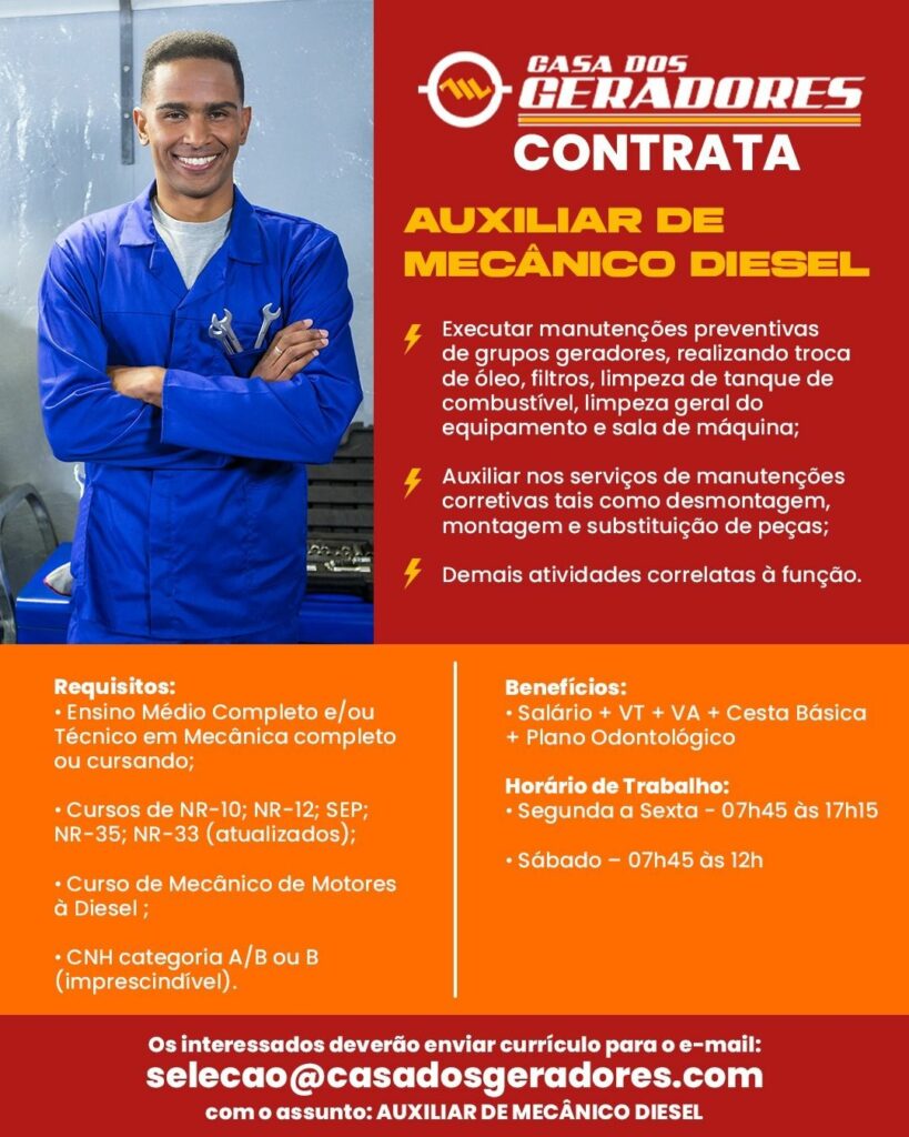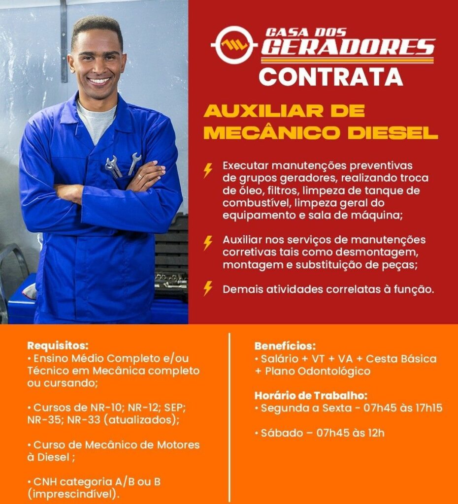 Casa dos geradores contrata Auxiliar de mecânico diesel; Envie seu currículo!