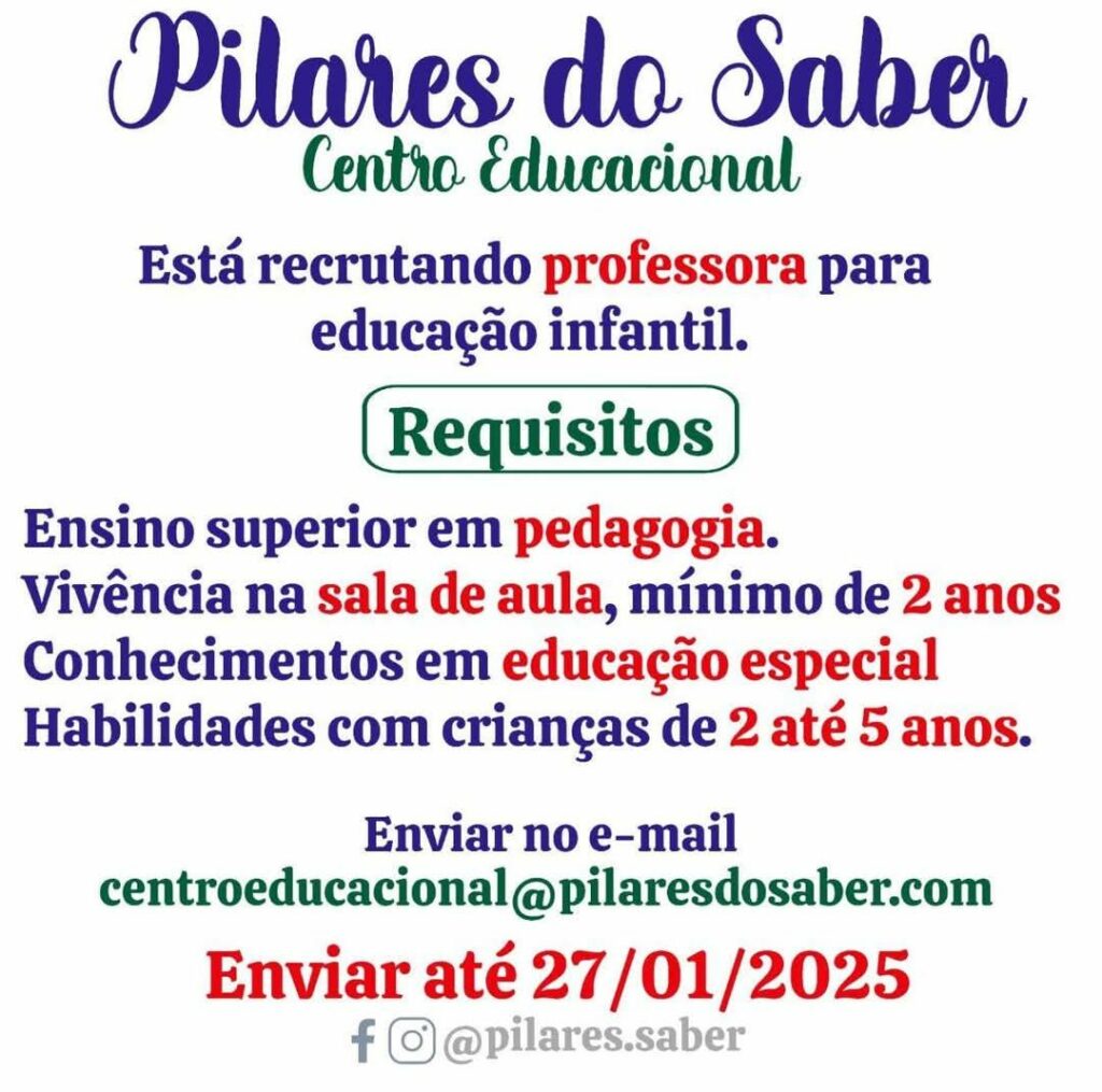 Centro educacional Pilares do saber contrata Professora Educação infantil; Envie seu currículo!