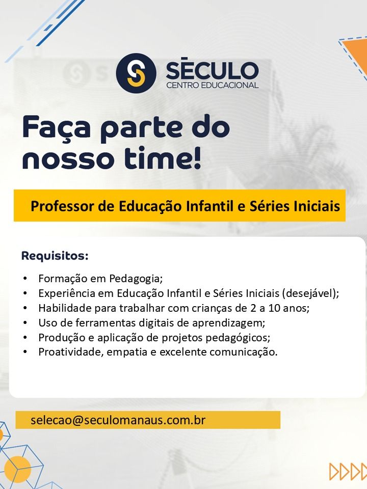 Centro educacional Século contrata Professor de educação infantil e séries iniciais; Envie seu currículo!