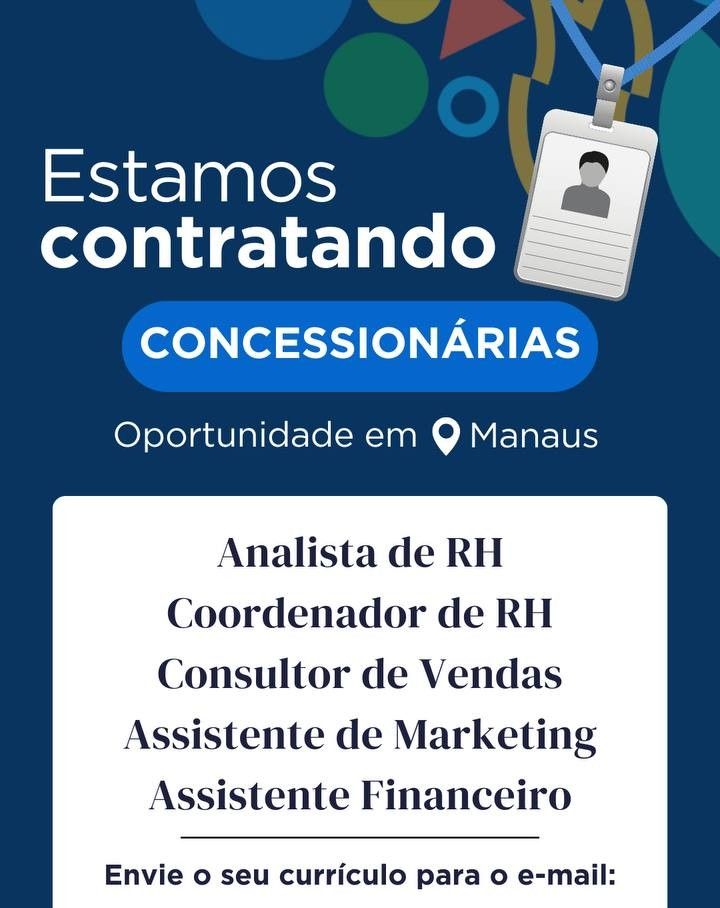 Concessionária seleciona Analista de rh, Coordenador de rh, Consultor de vendas, Assistente de marketing, Assistente financeiro; Envie seu currículo!