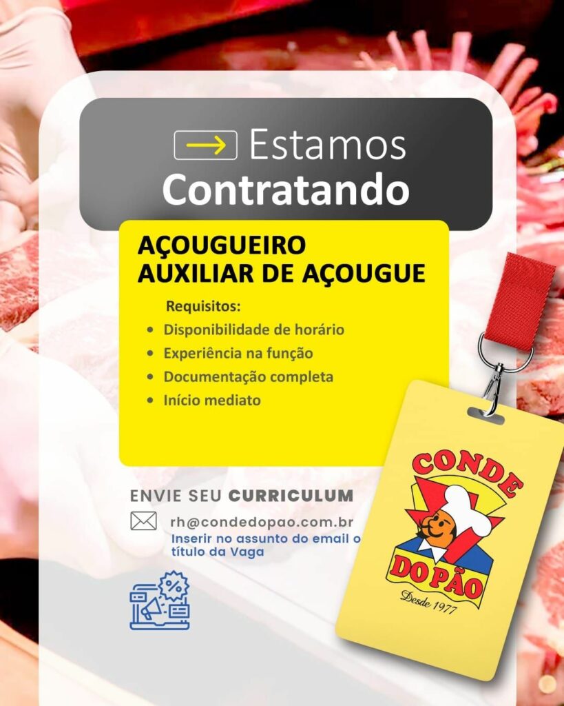 Conde do pão seleciona Açougueiro, Auxiliar de açougue; Envie seu currículo!