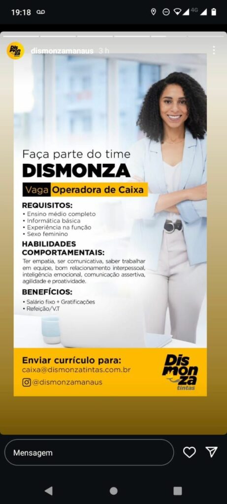 Dismonza tintas contrata Operadora de caixa; Envie seu currículo!
