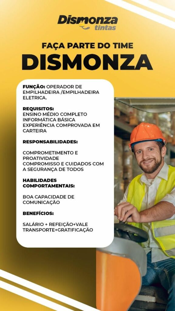 Dismonza tintas seleciona Auxiliar de estoque, Operador de empilhadeira elétrica; Envie seu currículo!