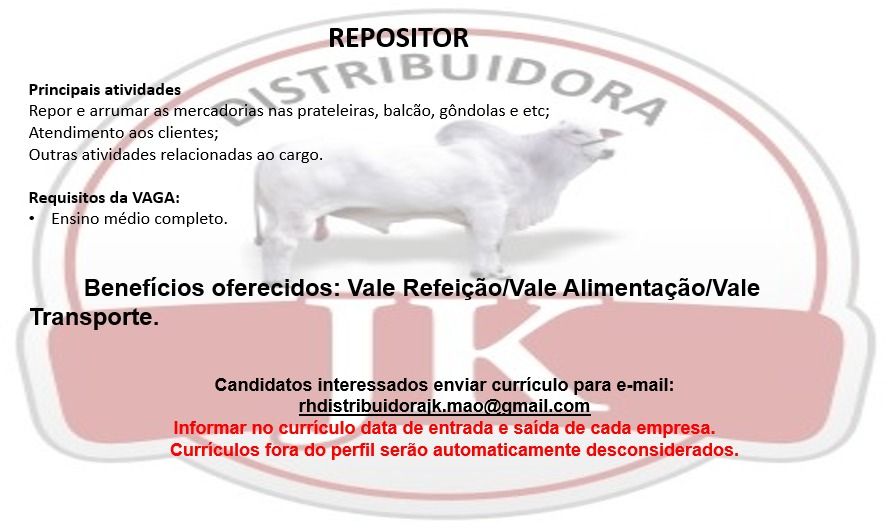 Distribuidora deseja contratar Repositor; Envie seu currículo!