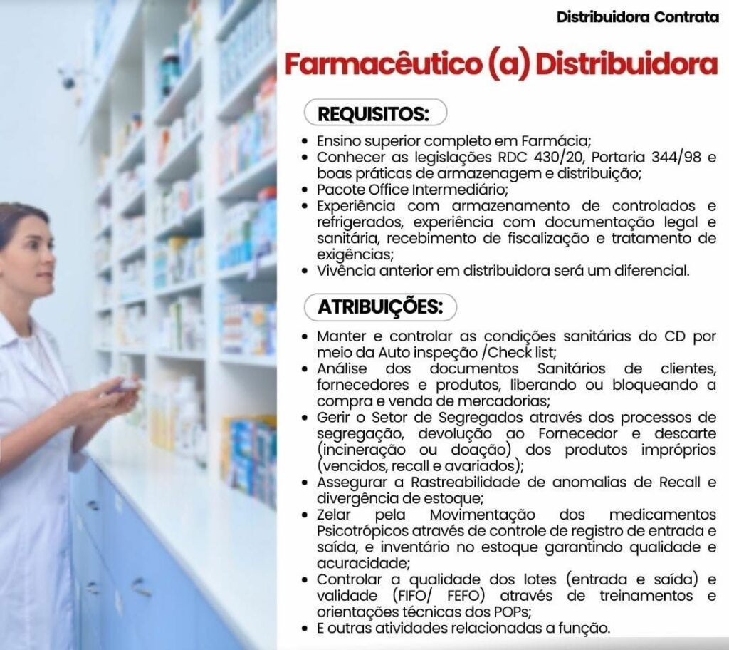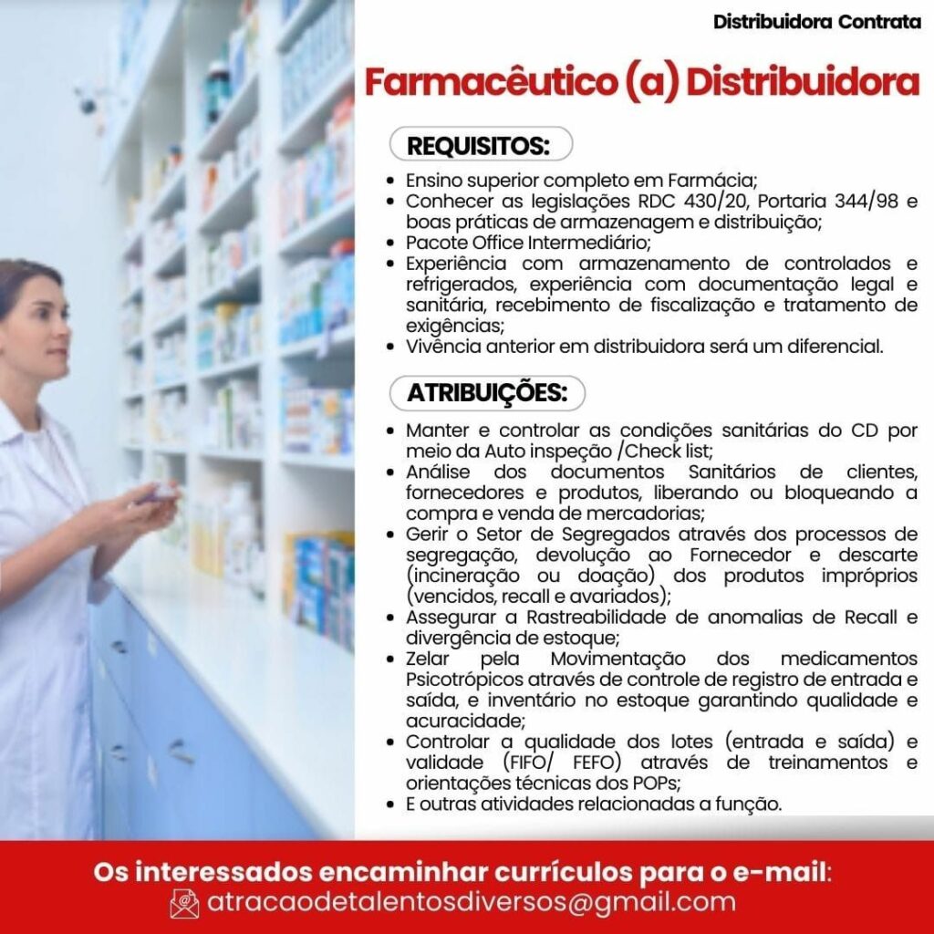 Distribuidora seleciona Farmacêutico (a) distribuidora; Envie seu currículo!