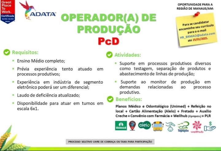 Empresa Adata deseja contratar Operador (a) de Produção; Envie seu currículo!