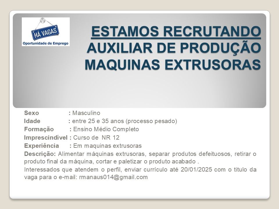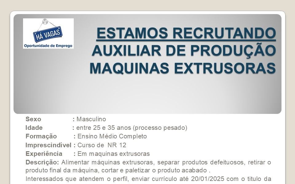 Empresa de grande porte contrata Auxiliar de produção máquinas Estrusora; Envie seu currículo!