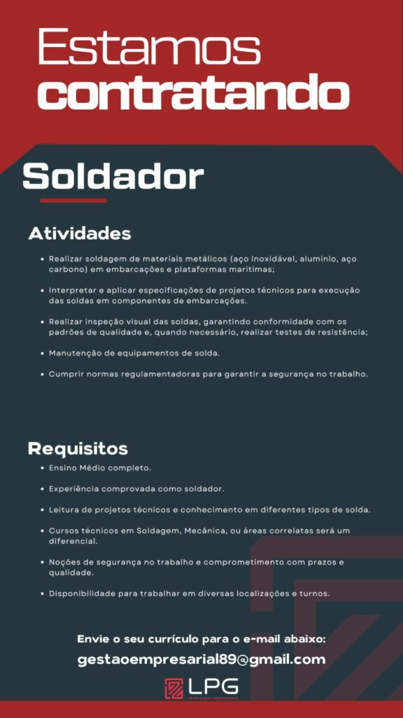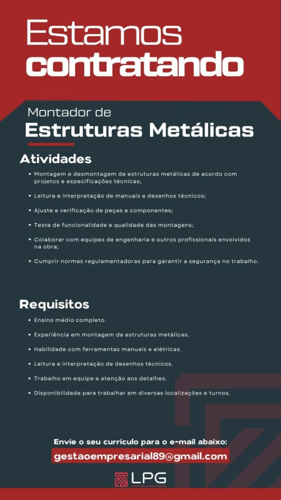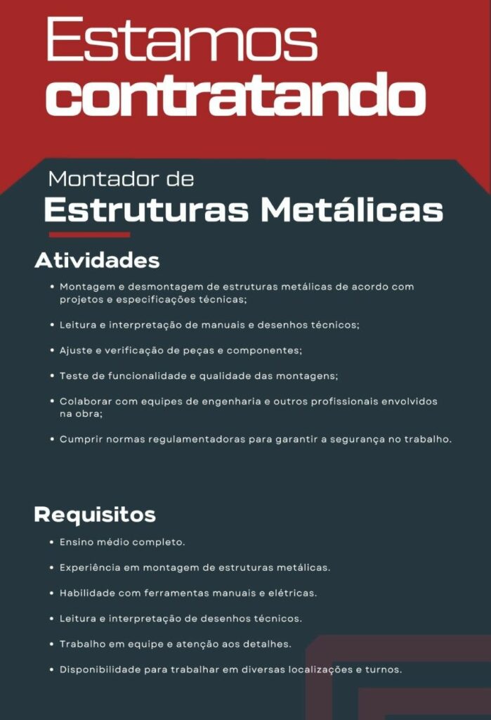 Empresa deseja contratar Montador de estrutura metálica, Soldador; Envie seu currículo!