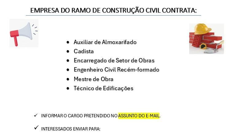 Empresa do ramo da construção civil contrata Auxiliar de almoxarifado, Cadista, Encarregado de setor de obras, Engenheiro civil, Mestre de obra, Técnico de edificações; Envie seu currículo!