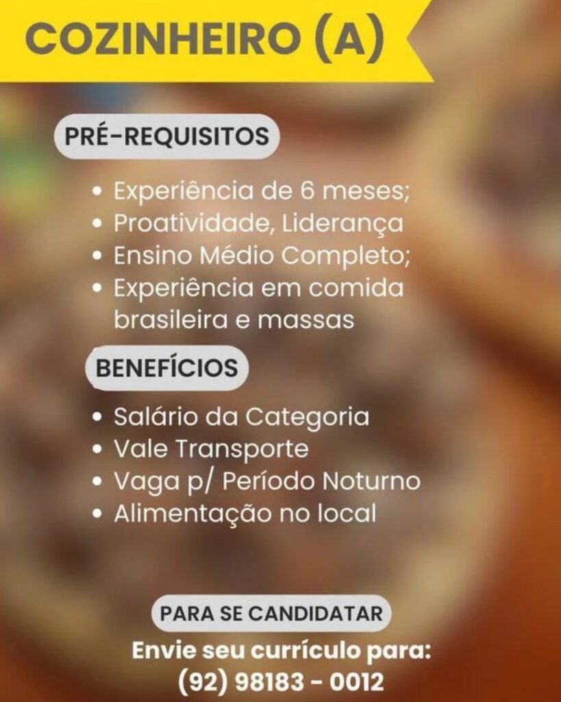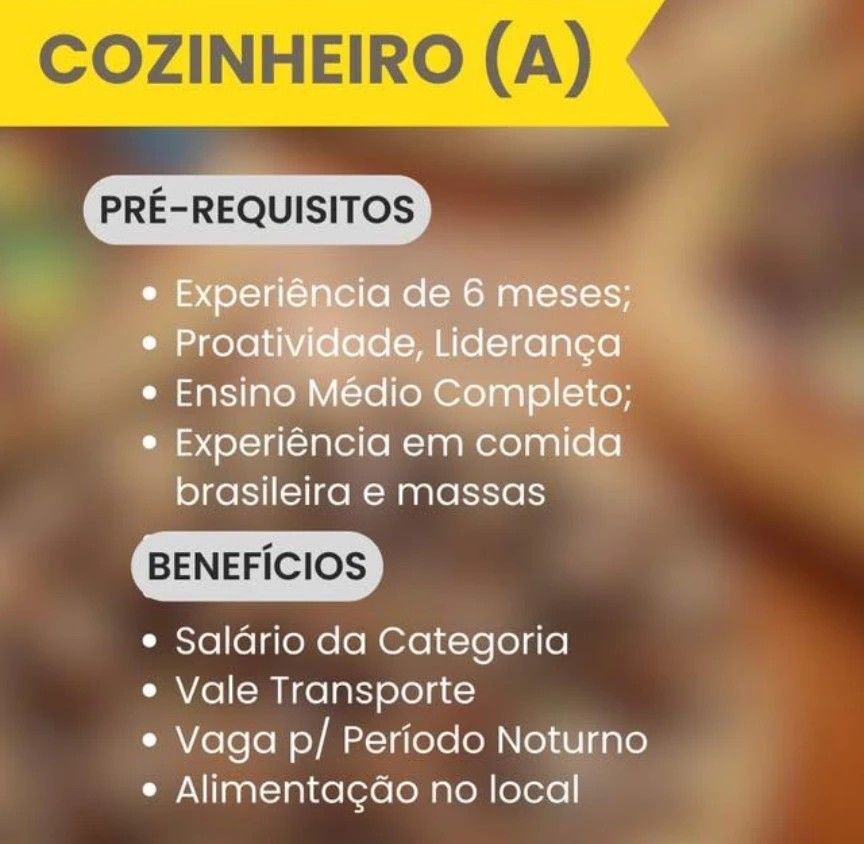 Empresa está selecionando Cozinheiro (a); Envie seu currículo!