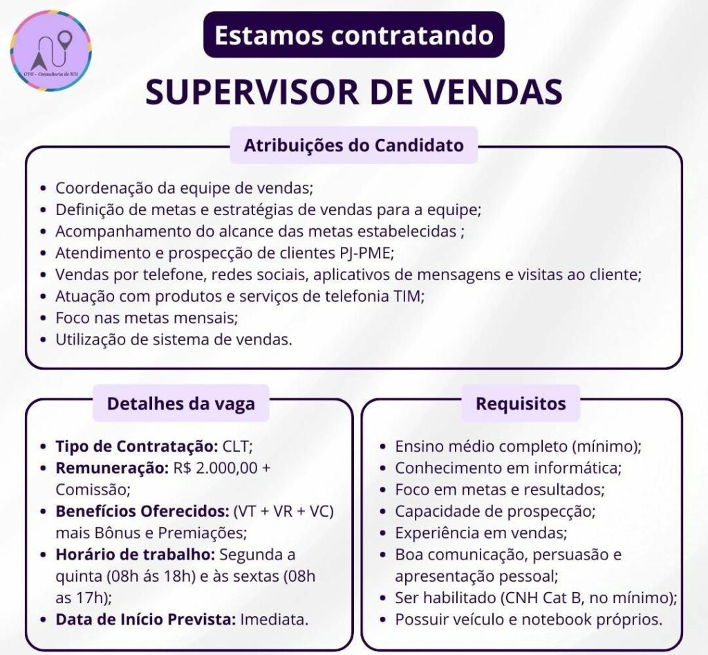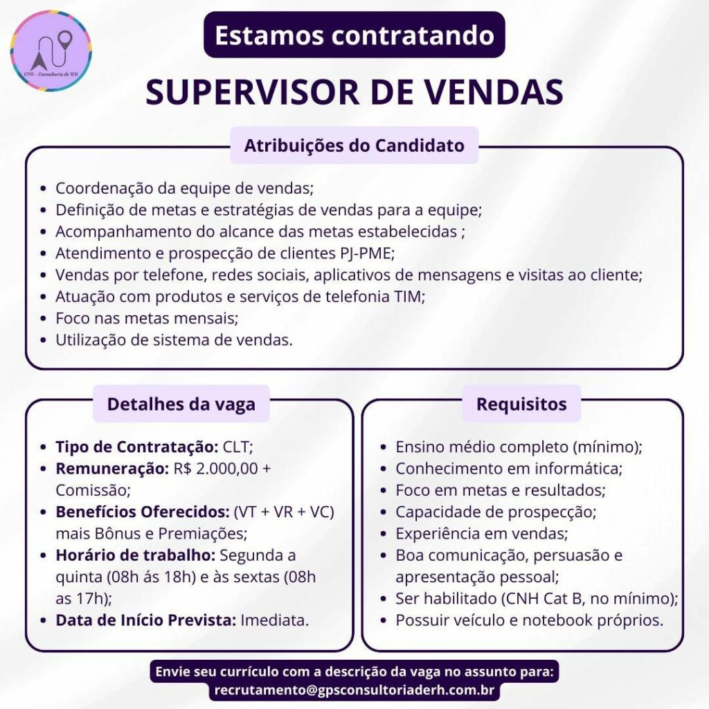Empresa está selecionando Supervisor de vendas; Envie seu currículo!