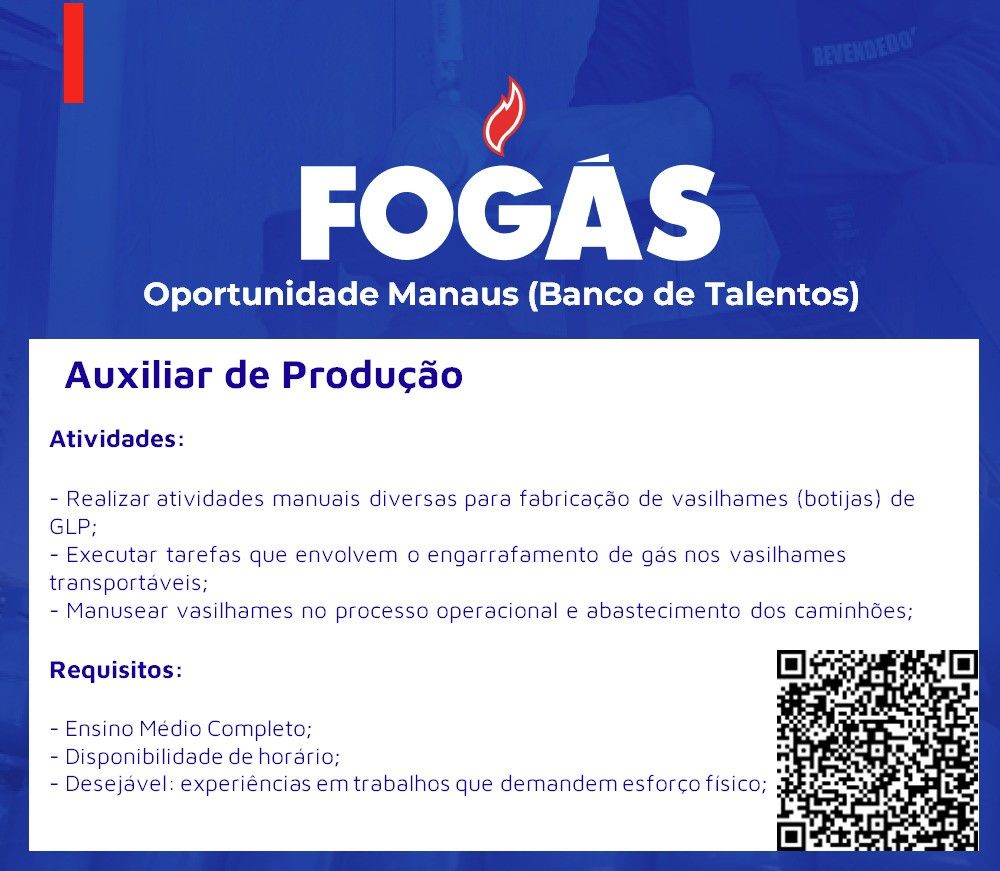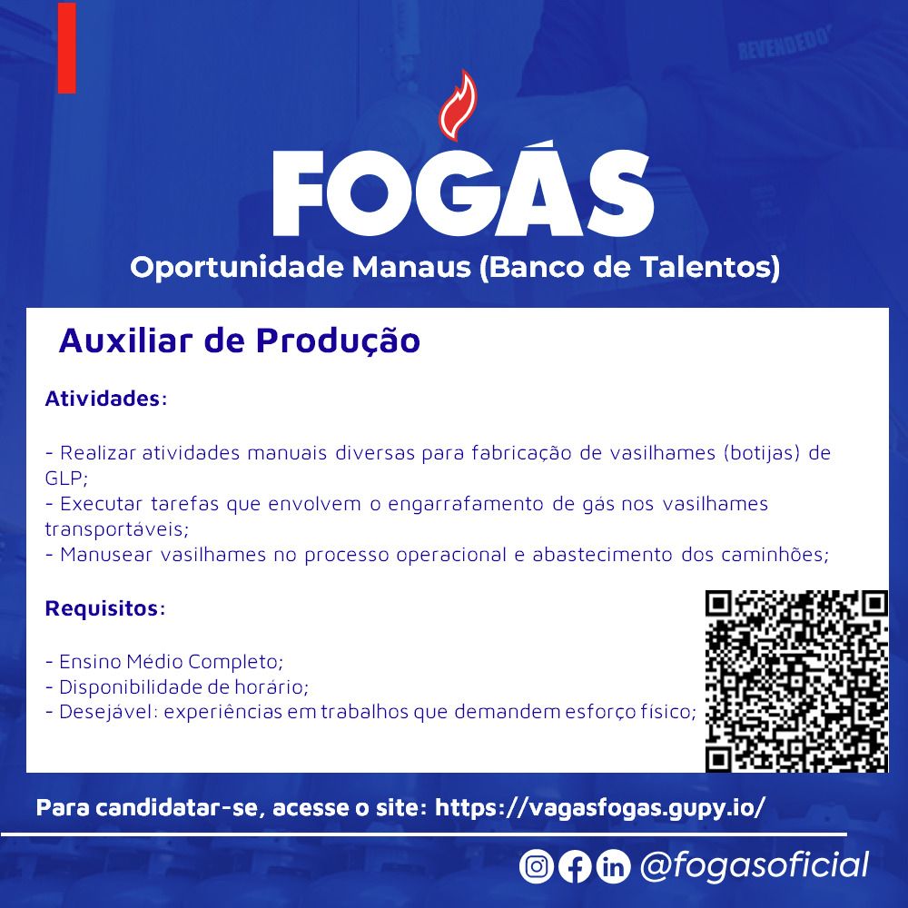 Empresa Fogás está contratando Auxiliar de produção; Envie seu currículo!