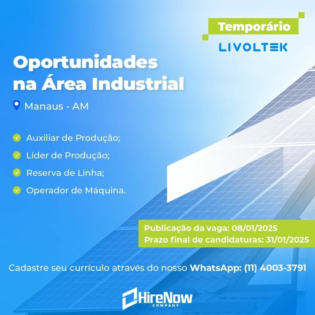 Empresa Livoltek seleciona Auxiliar de produção, Líder de Produção, Reserva de Linha, Operador de máquina; Envie seu currículo!