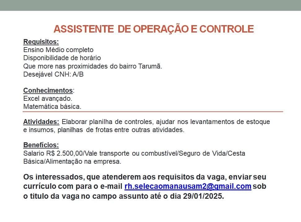 Empresa seleciona Assistente de operação e controle; Envie seu currículo!
