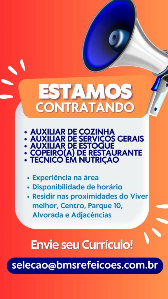 Empresa seleciona Auxiliar de cozinha, Auxiliar de serviços gerais, Auxiliar de estoque, Copeiro (a) de restaurante, Técnico em Nutrição; Envie seu currículo!