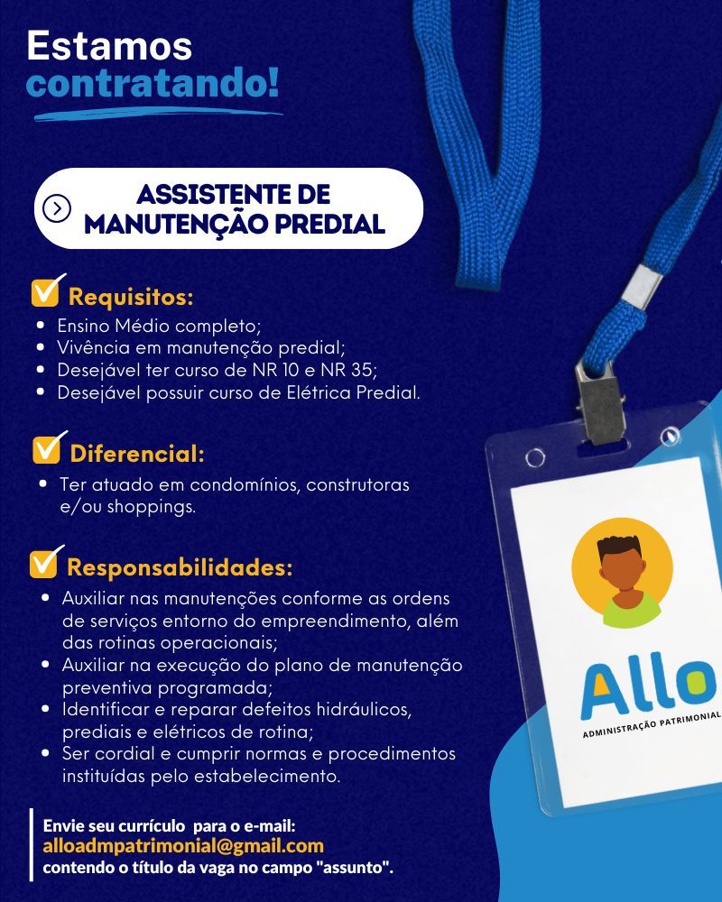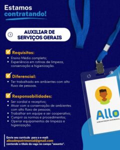 Empresa seleciona Auxiliar de serviços gerais, Assistente de Manuntenção predial; Envie seu currículo!