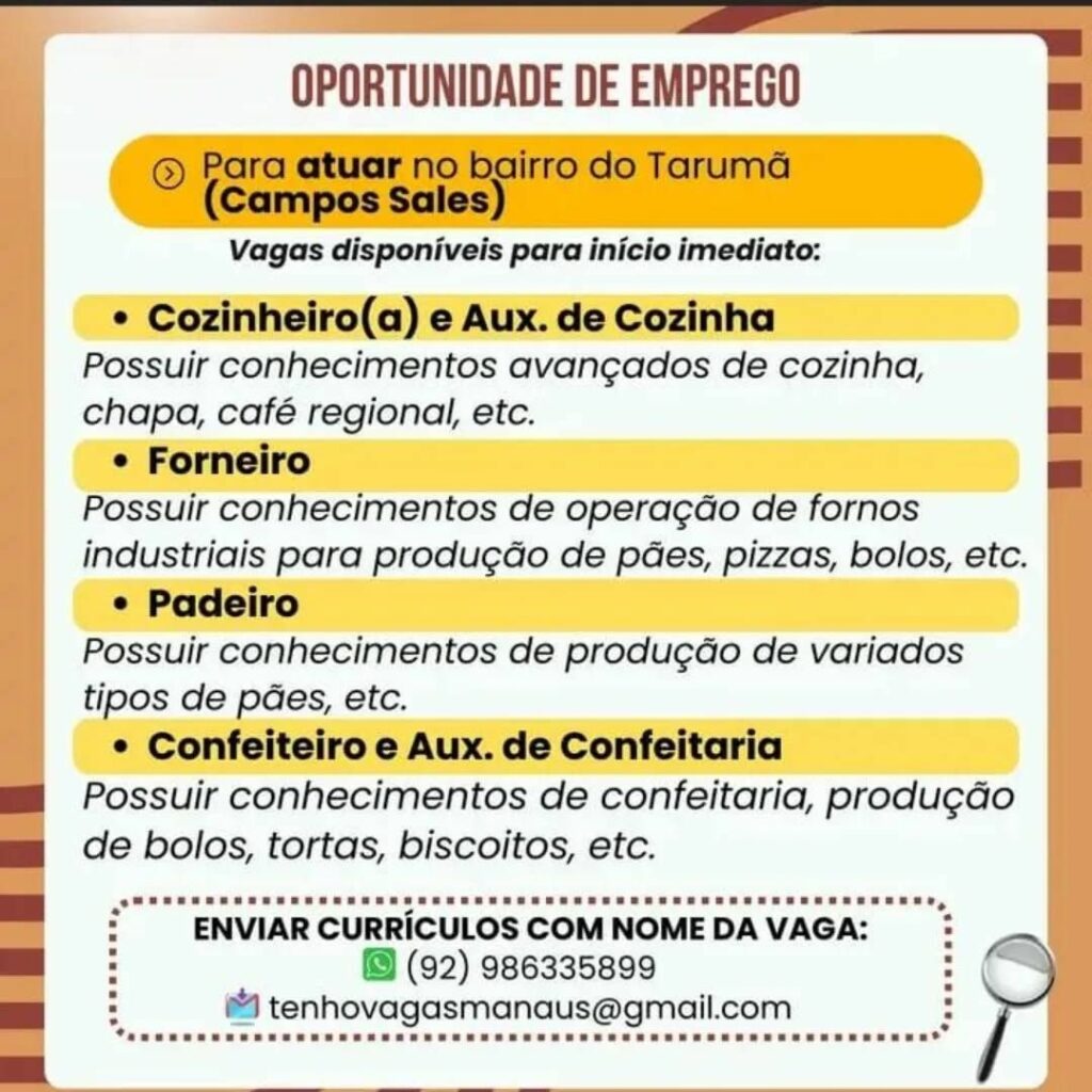 Empresa seleciona Cozinheiro (a), Auxiliar de cozinha, Forneiro, Padeiro, Confeiteiro, Auxiliar de confeitaria; Envie seu currículo!