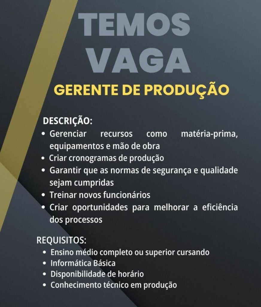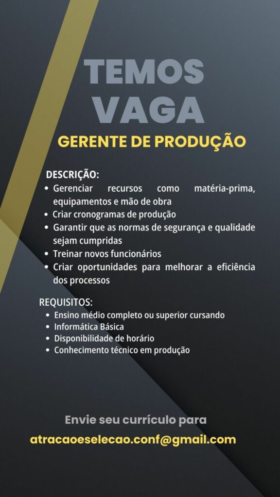Empresa seleciona Gerente de produção; Envie seu currículo!