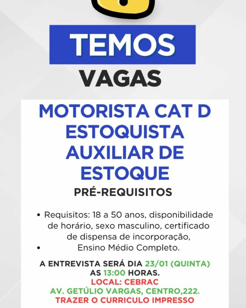 Empresa seleciona Motorista, Estoquista, Auxiliar de Estoque; Envie seu currículo!