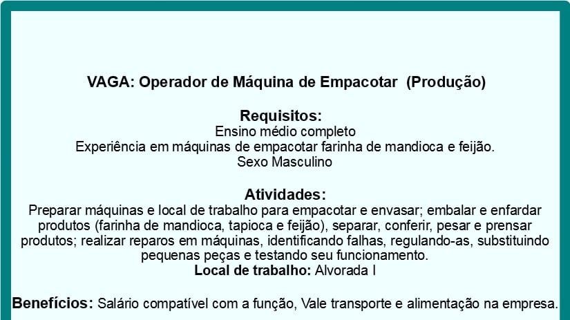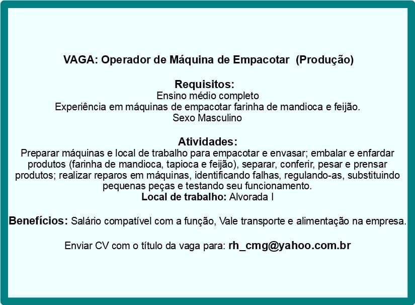 Empresa seleciona Operador de máquina de empacotar; Envie seu currículo!