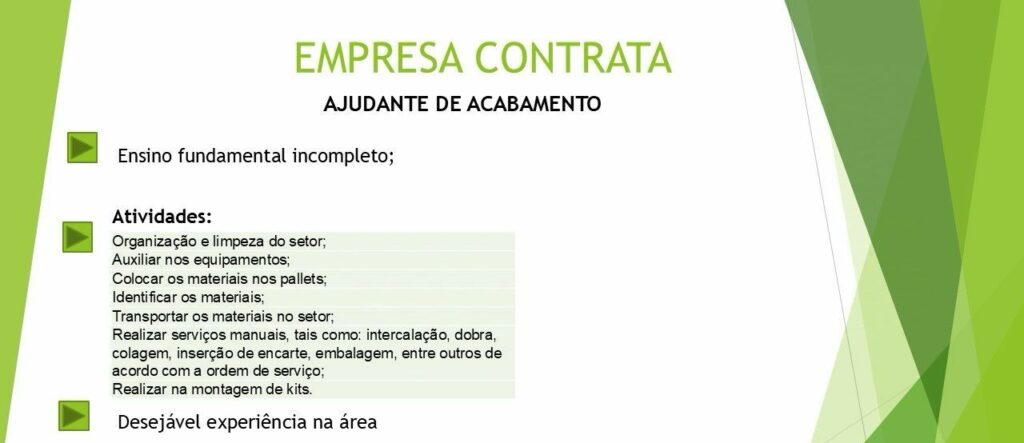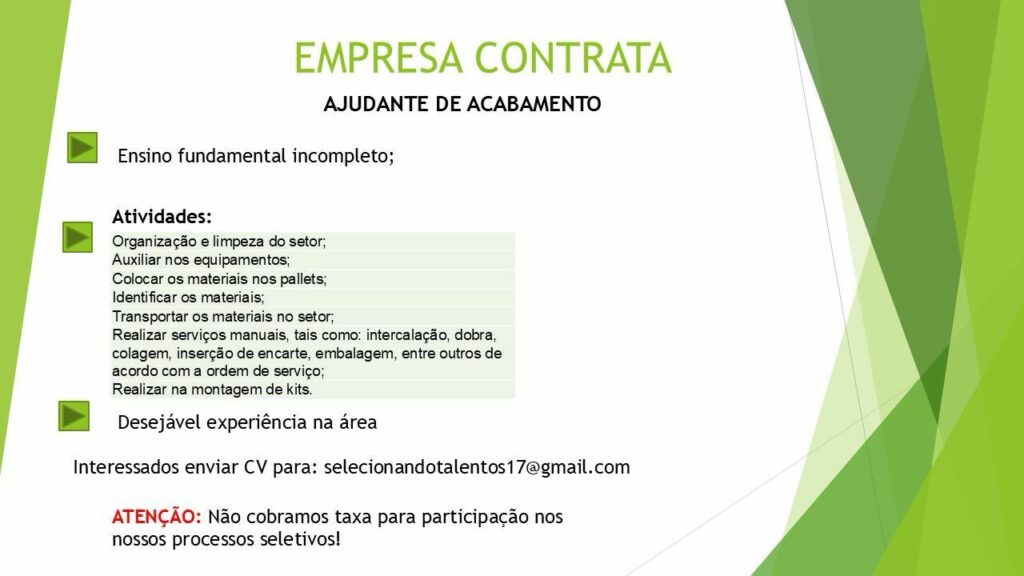 Empresa seleciona para vaga de Ajudante de acabamento; Envie seu currículo!
