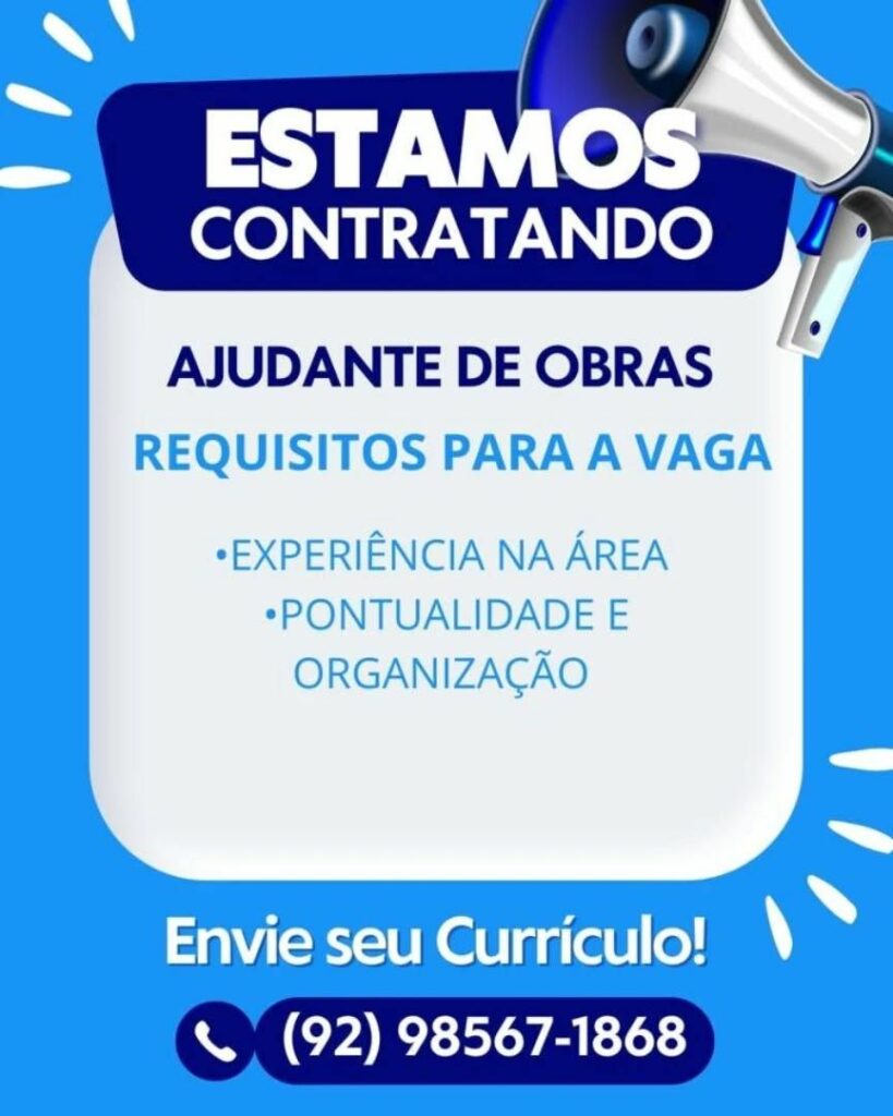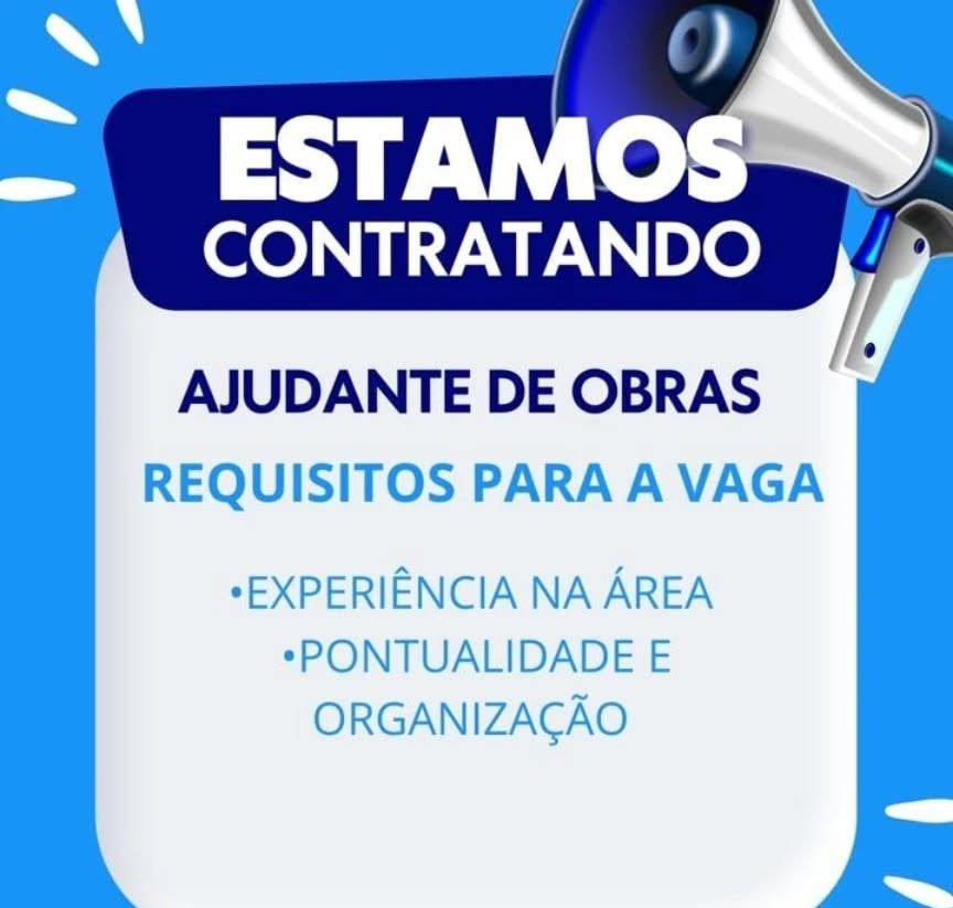 Empresa seleciona para vaga de Ajudante de obras; Envie seu currículo!