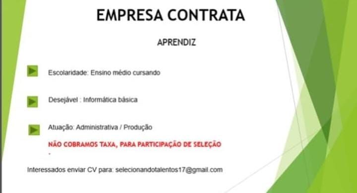 Empresa seleciona para vaga de Aprendiz; Envie seu currículo!