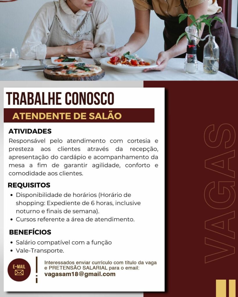 Empresa seleciona para vaga de Atendente de salão; Envie seu currículo!