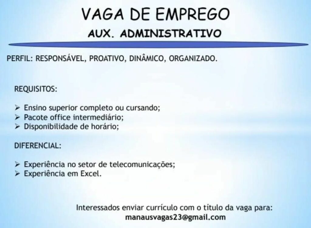 Empresa seleciona para vaga de Auxiliar administrativo; Envie seu currículo!