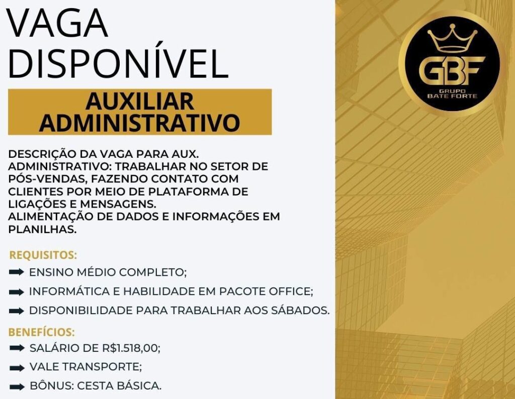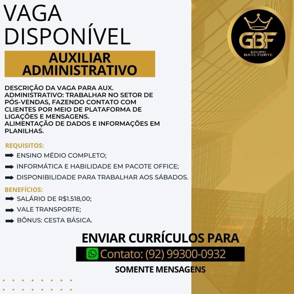 Empresa seleciona para vaga de Auxiliar administrativo; Envie seu currículo!