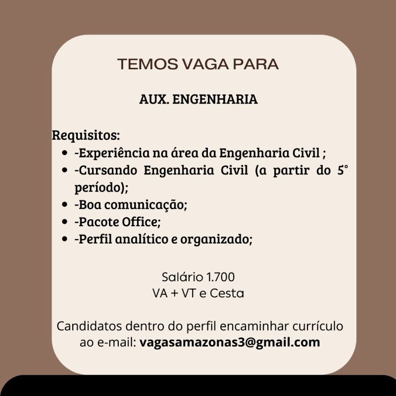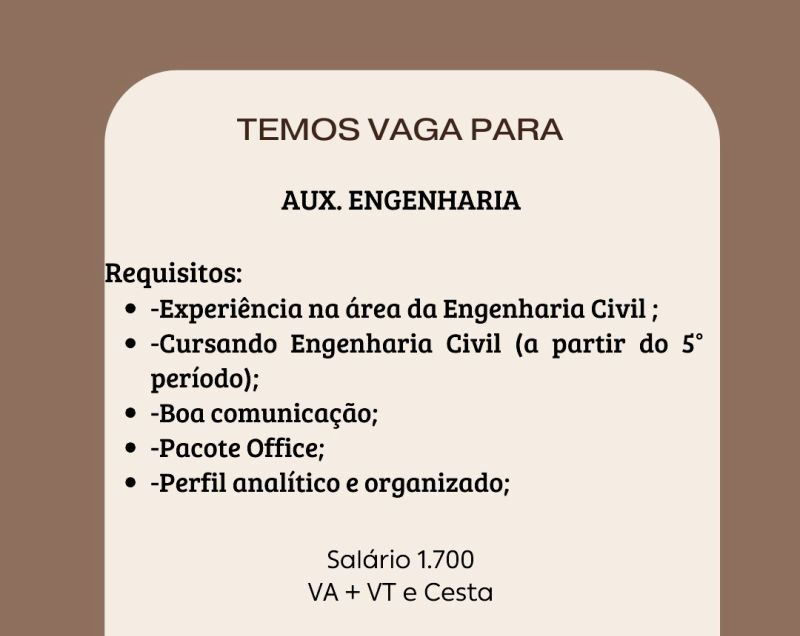 Empresa seleciona para vaga de Auxiliar de engenharia; Envie seu currículo!
