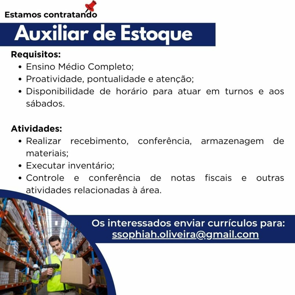 Empresa seleciona para vaga de Auxiliar de estoque; Envie seu currículo!