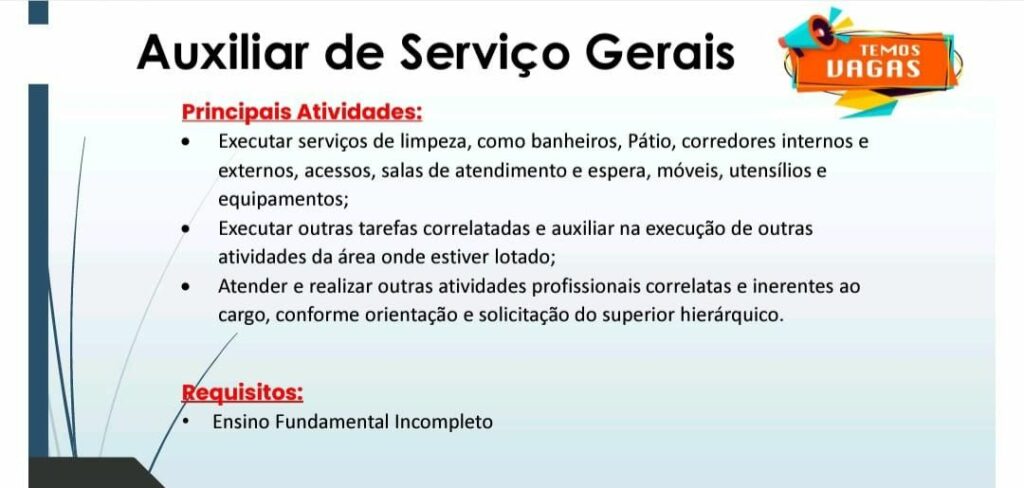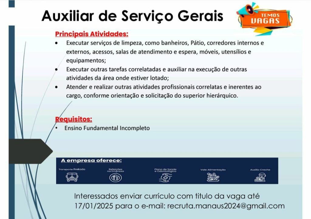 Empresa seleciona para vaga de Auxiliar de serviços gerais; Envie seu currículo!