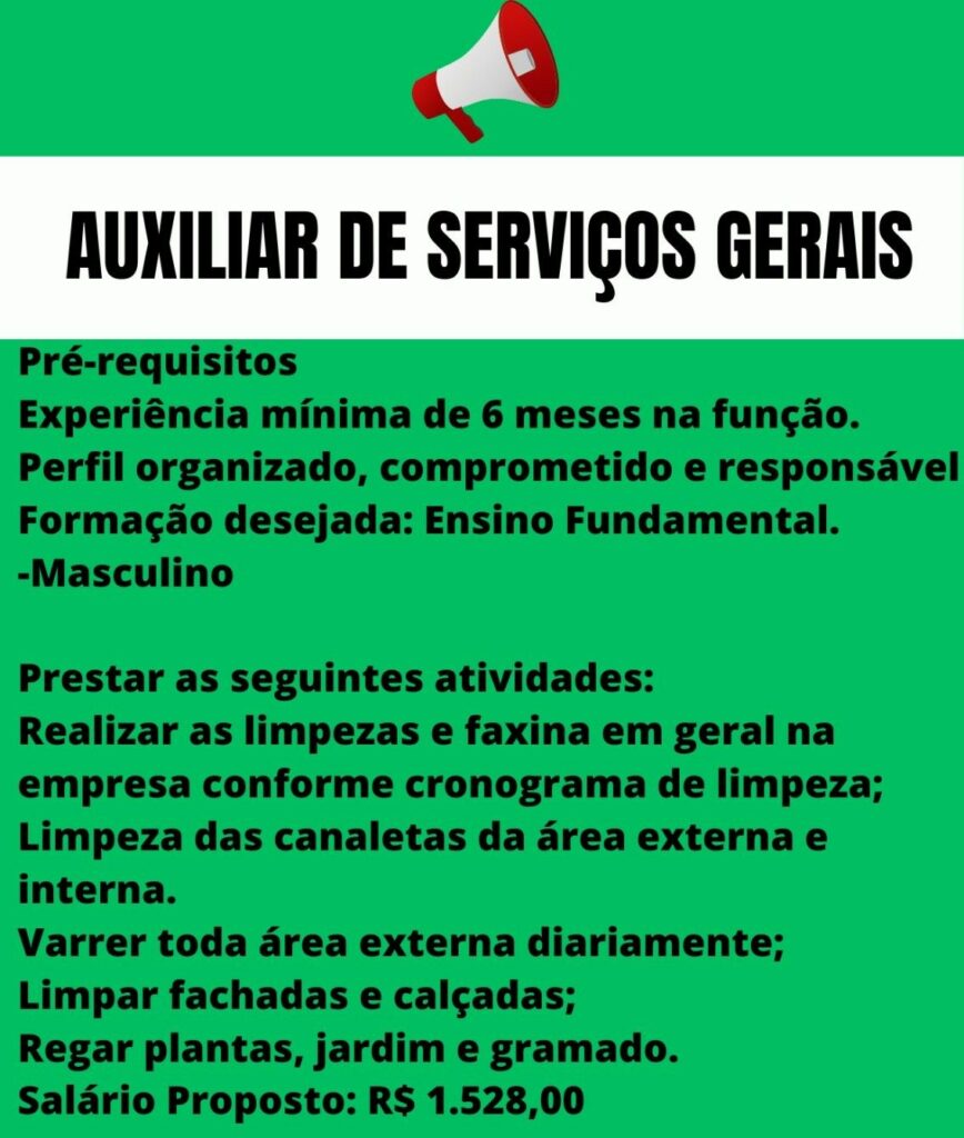 Empresa seleciona para vaga de Auxiliar de serviços gerais; Envie seu currículo!