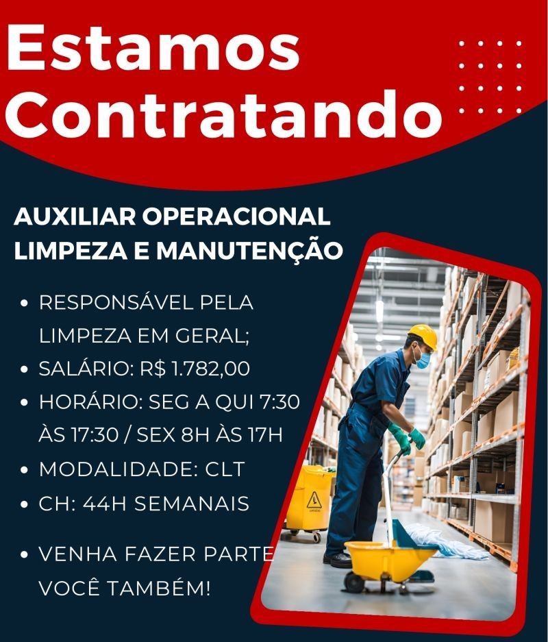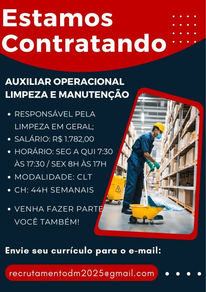 Empresa seleciona para vaga de Auxiliar operacional limpeza e manutenção; Envie seu currículo!