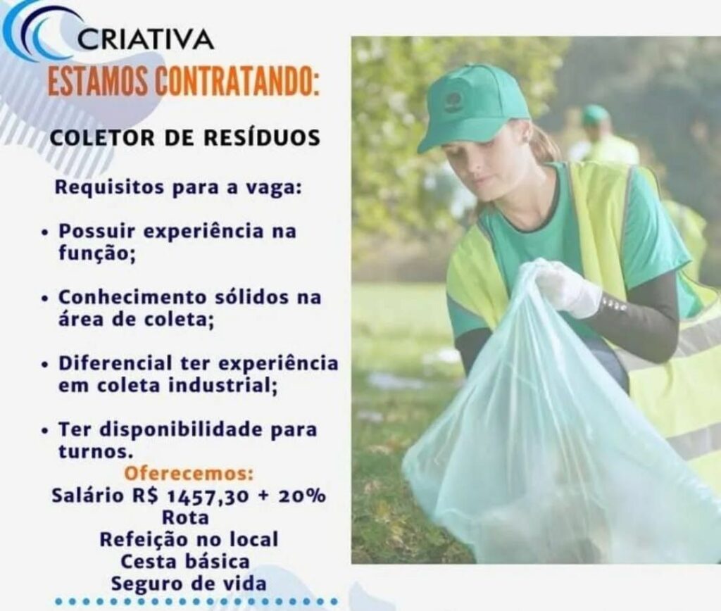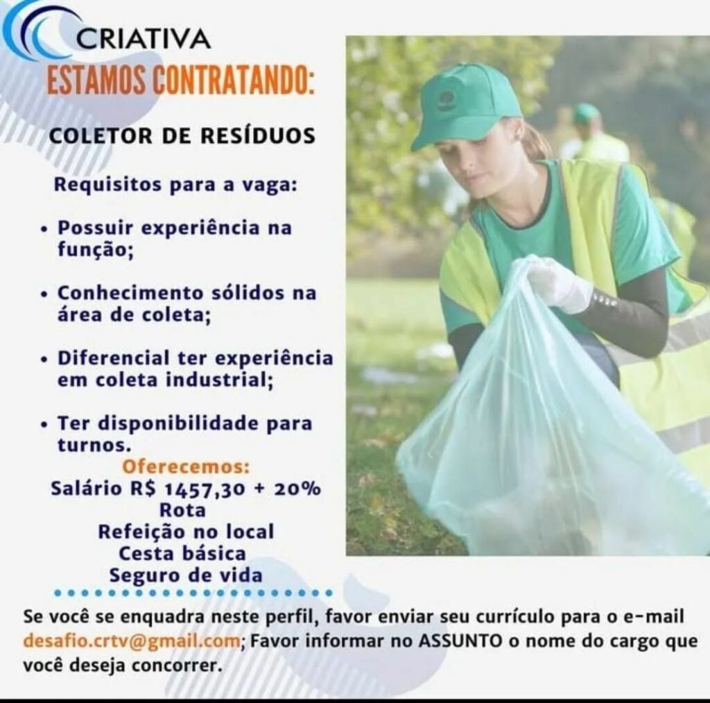 Empresa seleciona para vaga de Coletor de resíduos; Envie seu currículo!