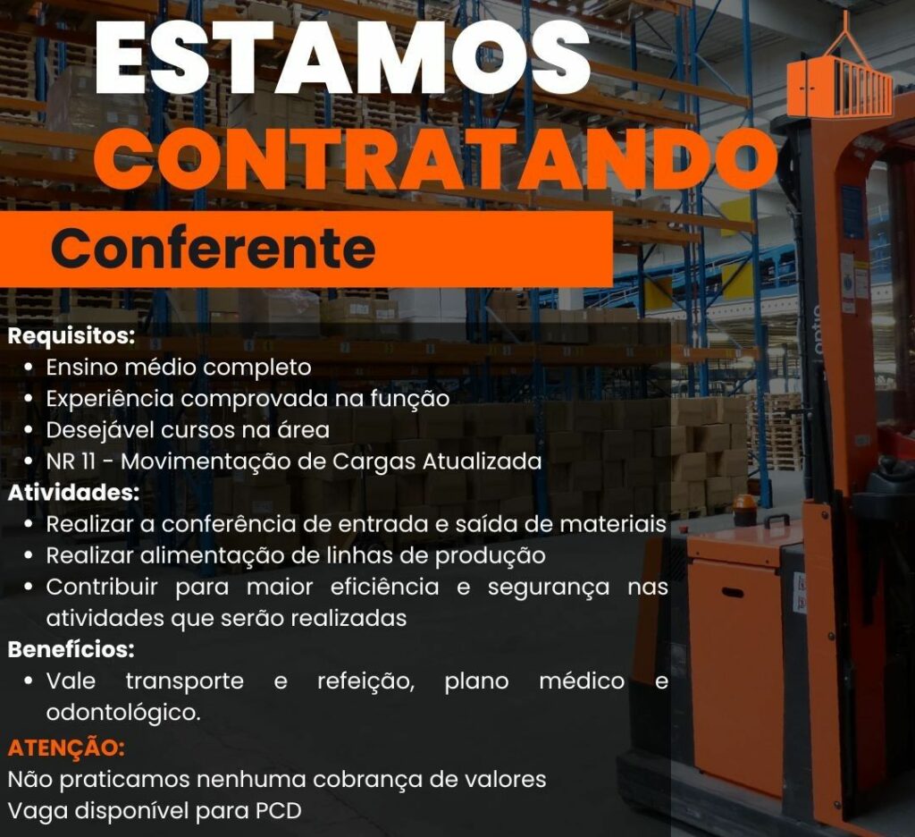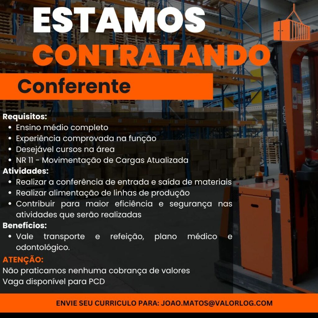 Empresa seleciona para vaga de Conferente; Envie seu currículo!