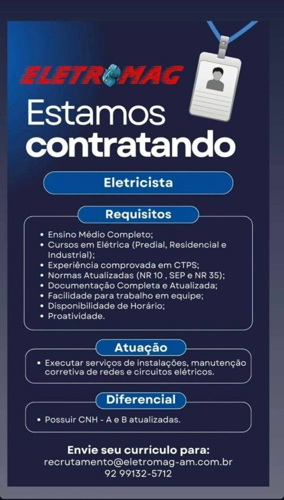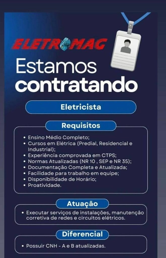 Empresa seleciona para vaga de Eletricista; Envie seu currículo!