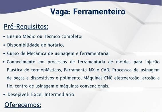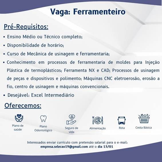 Empresa seleciona para vaga de Ferramenteiro; Envie seu currículo!
