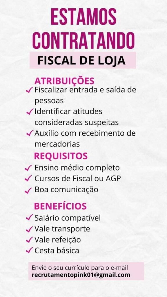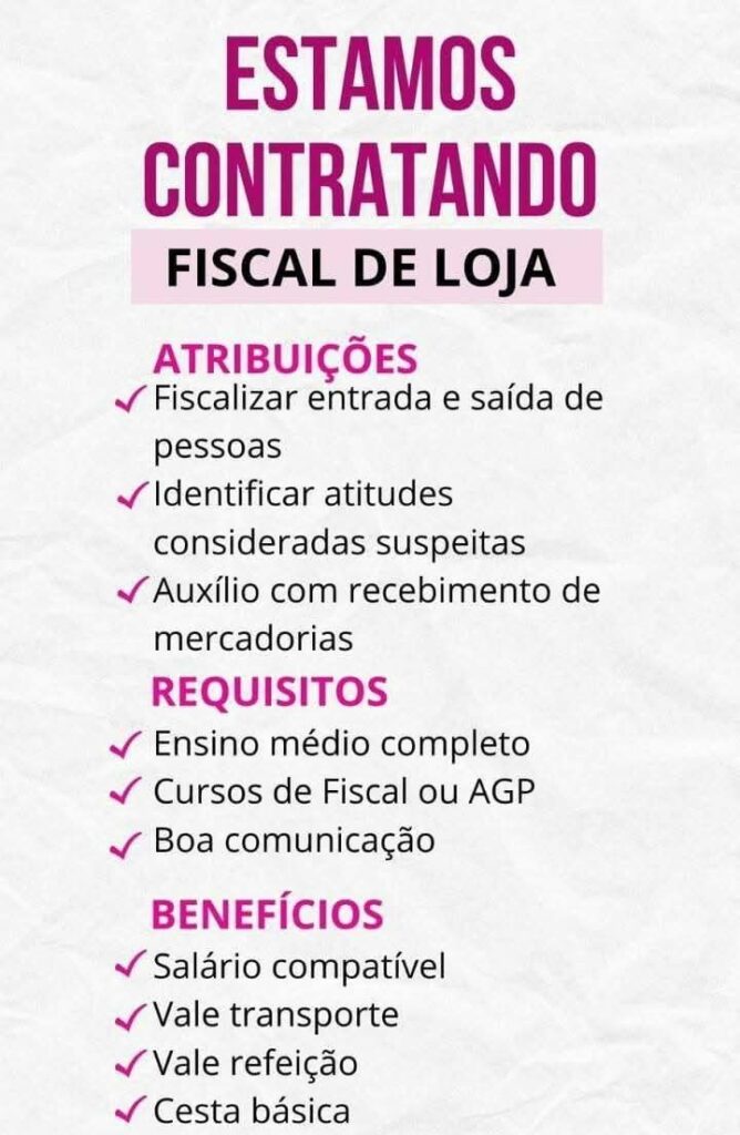 Empresa seleciona para vaga de Fiscal de loja; Envie seu currículo!