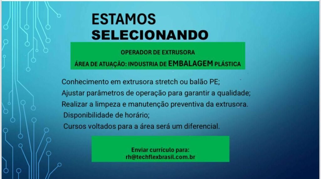 Empresa seleciona para vaga de Operador de extrusora; Envie seu currículo!
