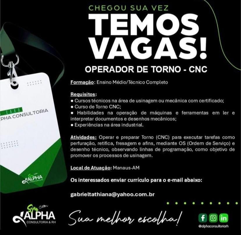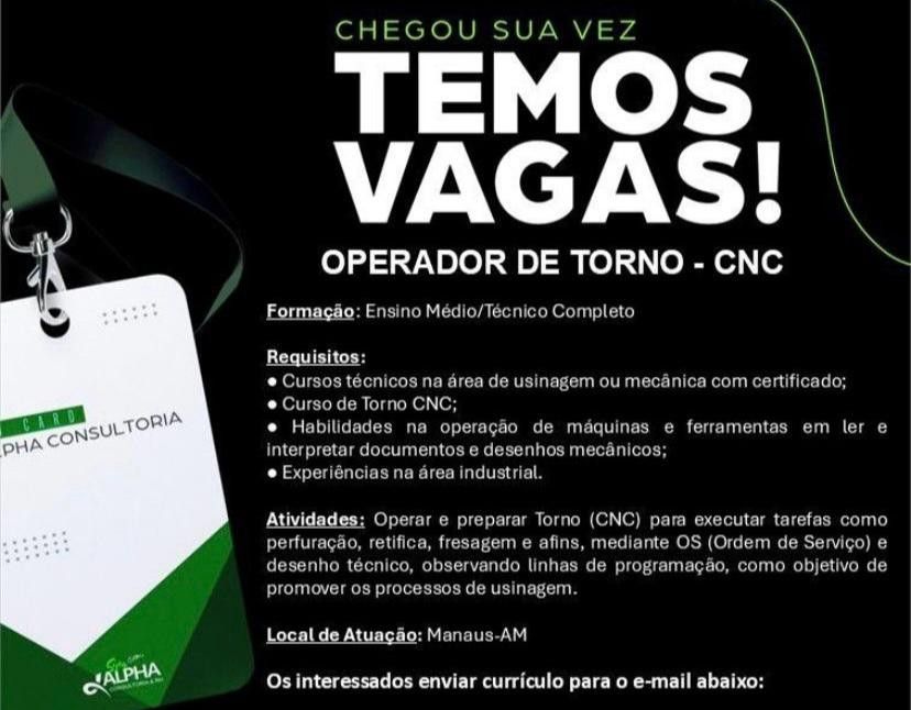 Empresa seleciona para vaga de Operador de torno cnc; Envie seu currículo!