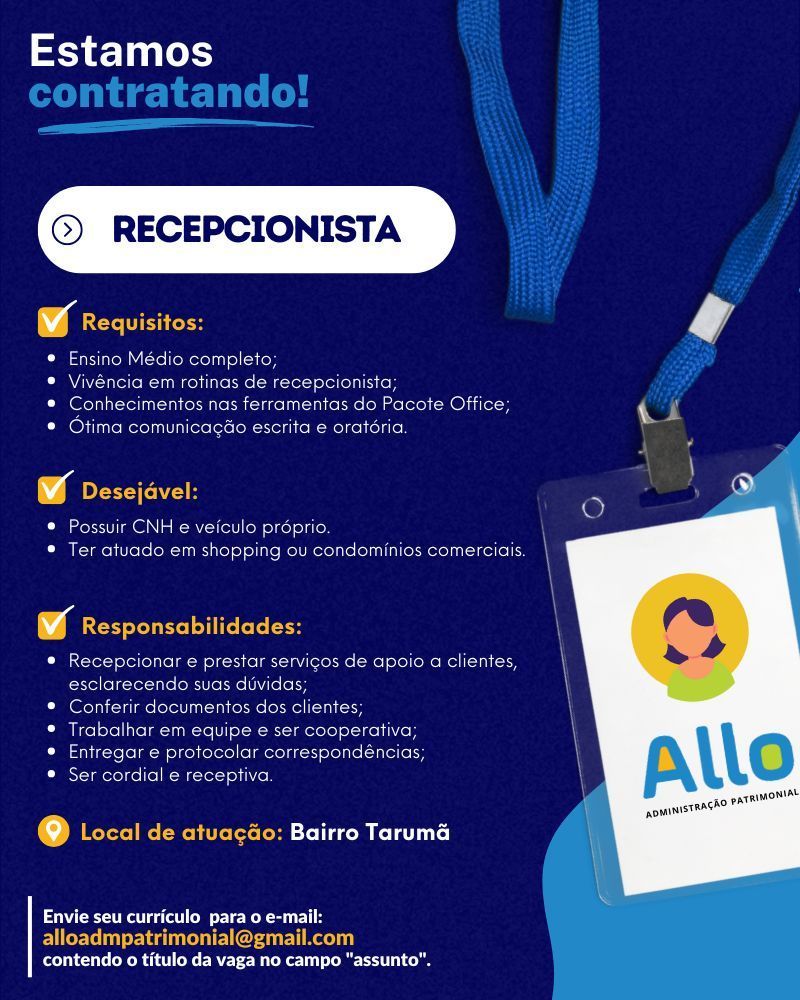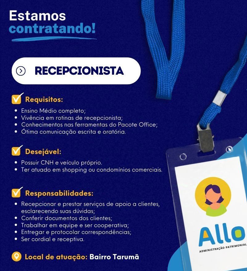 Empresa seleciona para vaga de Recepcionista; Envie seu currículo!