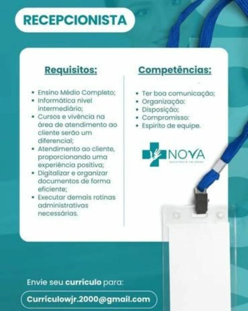 Empresa seleciona para vaga de Recepcionista; Envie seu currículo!