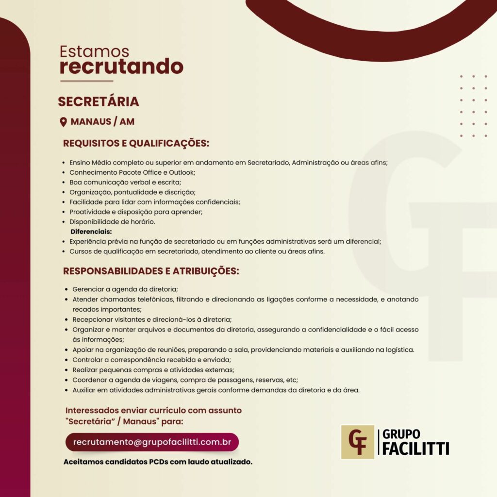 Empresa seleciona para vaga de Secretária; Envie seu currículo!